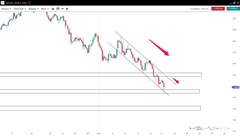 Gold is still moving lower where it is trading inside a bearish channel. The yellow metal reached an area of confluence made from the lower end of the channel and the strong support around the 1,750 mark. There is a chance for a retracement higher towards resistance (1,825) where sellers could jump back in and push the price lower.