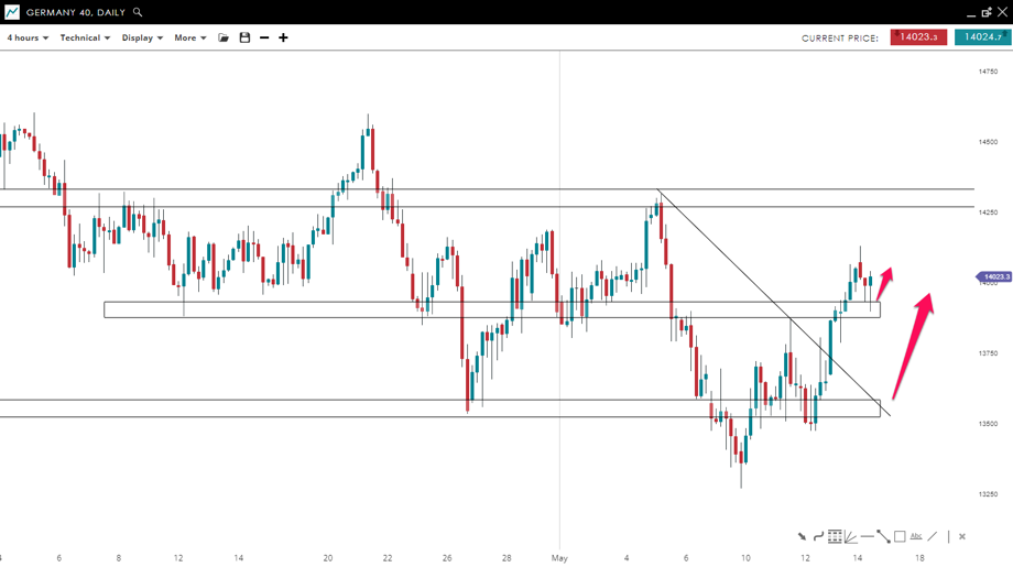 The price of GER40 tested the 13,560 level (April low) and reversed higher and broke a bearish trendline to the upside. In addition, the bulls successfully broke and closed above the 13,900 round number, which could lead to a further move upwards towards 14,300 if the buyers will continue to control the market.