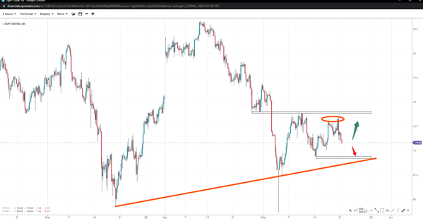 Crude oil formed a double top at $73.30/bbl, but the likelihood of a move past it has increased following the flag low of $69.40/bbl. Above $73.80/bbl, bulls might face stiff resistance near $75/bbl. If bears lose control of $71.60/bbl, they might reclaim the bottom or at least experience a $70/bbl rejection.