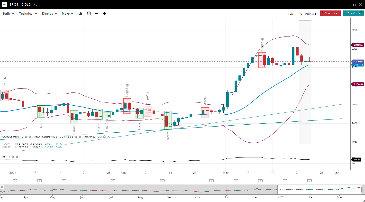 Gold continues in a bullish trend and is still in the impulsive phase, with the price consolidating to 2,166, marginally above the 20-period VWAP of 2,157. The support level has been revised to 2,104, with resistance now at 2,210. The RSI has decreased to 60, still reflecting strong bullish sentiment but slightly less than before.