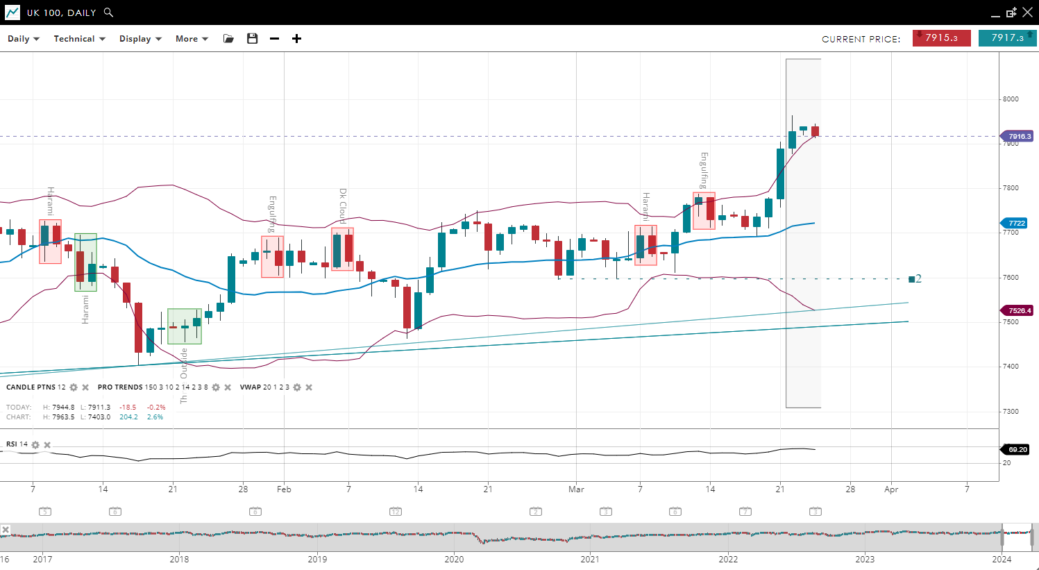 UK 100 | Bullish | Impulsive | 7916 | 7722 | 7526 | 7917 | 69 |