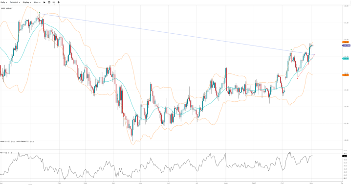 USD/JPY continues its bullish impulsive trend, now trading at 154.13, above the VWAP of 152.19. The RSI at 66.3 shows strong upward pressure. Support lies at 149.74, with resistance at 154.64.