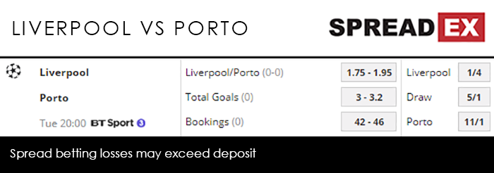 Porto, meanwhile, have benefited from a relatively kind draw. They topped a group that included Schalke, Galatasaray and Lokomotiv Moscow, before beating Roma 4-3 on aggregate (but only after extra-time in the 2nd leg). On paper the Reds should be fairly unruffled, with Spreadex offering a Liverpool/Porto Goal Supremacy spread of 1.75-1.95, alongside an average target price of 3-3.2.