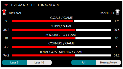 To see all the Arsenal v Man Utd betting stats and form, visit our pricing page to view our Pre-Match betting stats table or hover over/tap the chart image to see previous outcomes for that particular market.