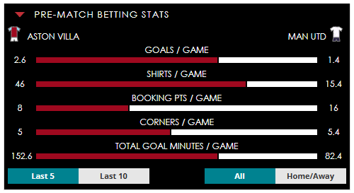 To see all the Aston Villa v Man Utd betting stats and form, visit our pricing page to view our Pre-Match betting stats table or hover over/tap the chart image to see previous outcomes for that particular market.