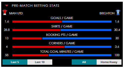 To see all the Man Utd v Brighton betting stats and form, visit our pricing page to view our Pre-Match betting stats table or hover over/tap the chart image to see previous outcomes for that particular market.